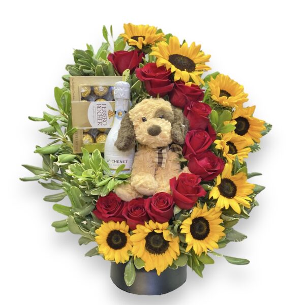 Este hermoso arreglo floral combina la luminosidad de los girasoles con la ternura de un peluche y la dulzura de una bebida. Los girasoles, con su cálido resplandor, son el centro de atención de este arreglo, transmitiendo alegría y felicidad.